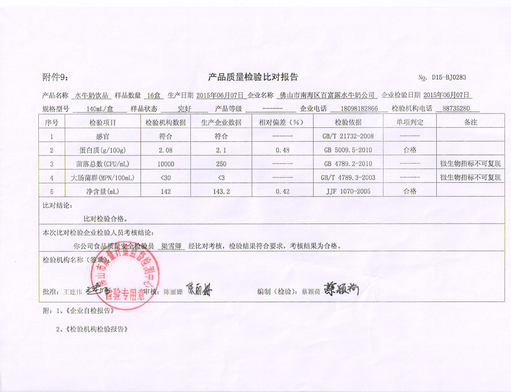 2016年7月10日鲜水牛奶检验报告