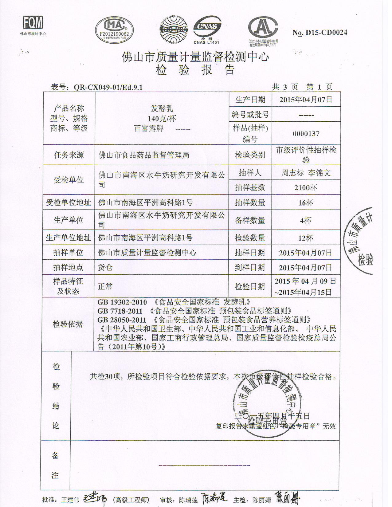 2016年4月17日发酵乳检验报告