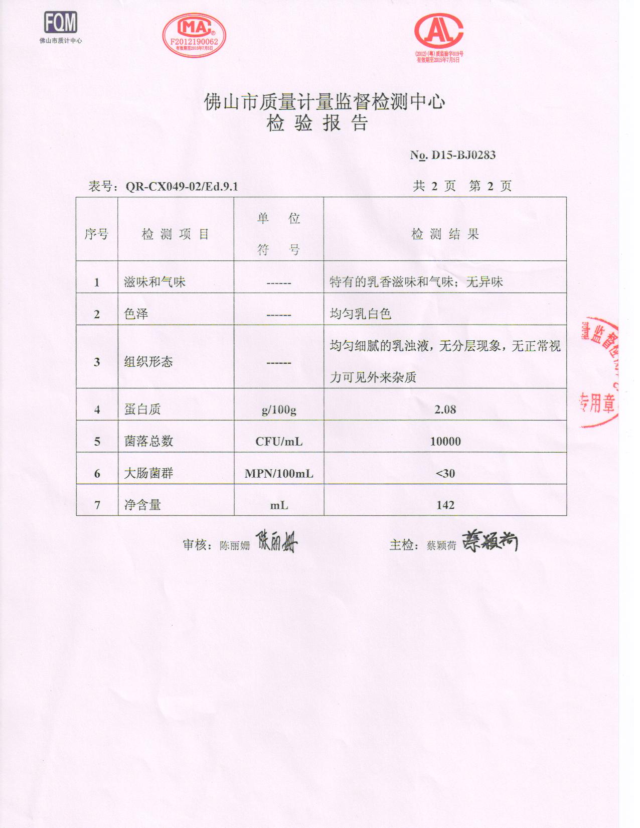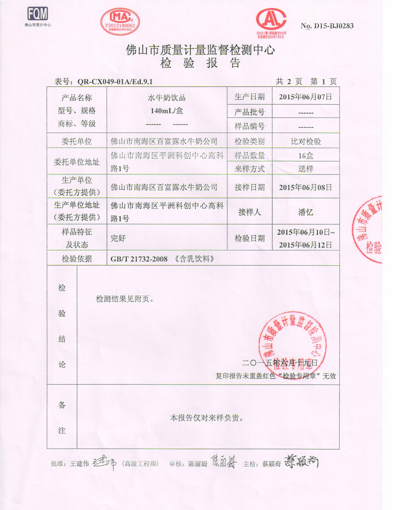 2016年7月10日鲜水牛奶检验报告